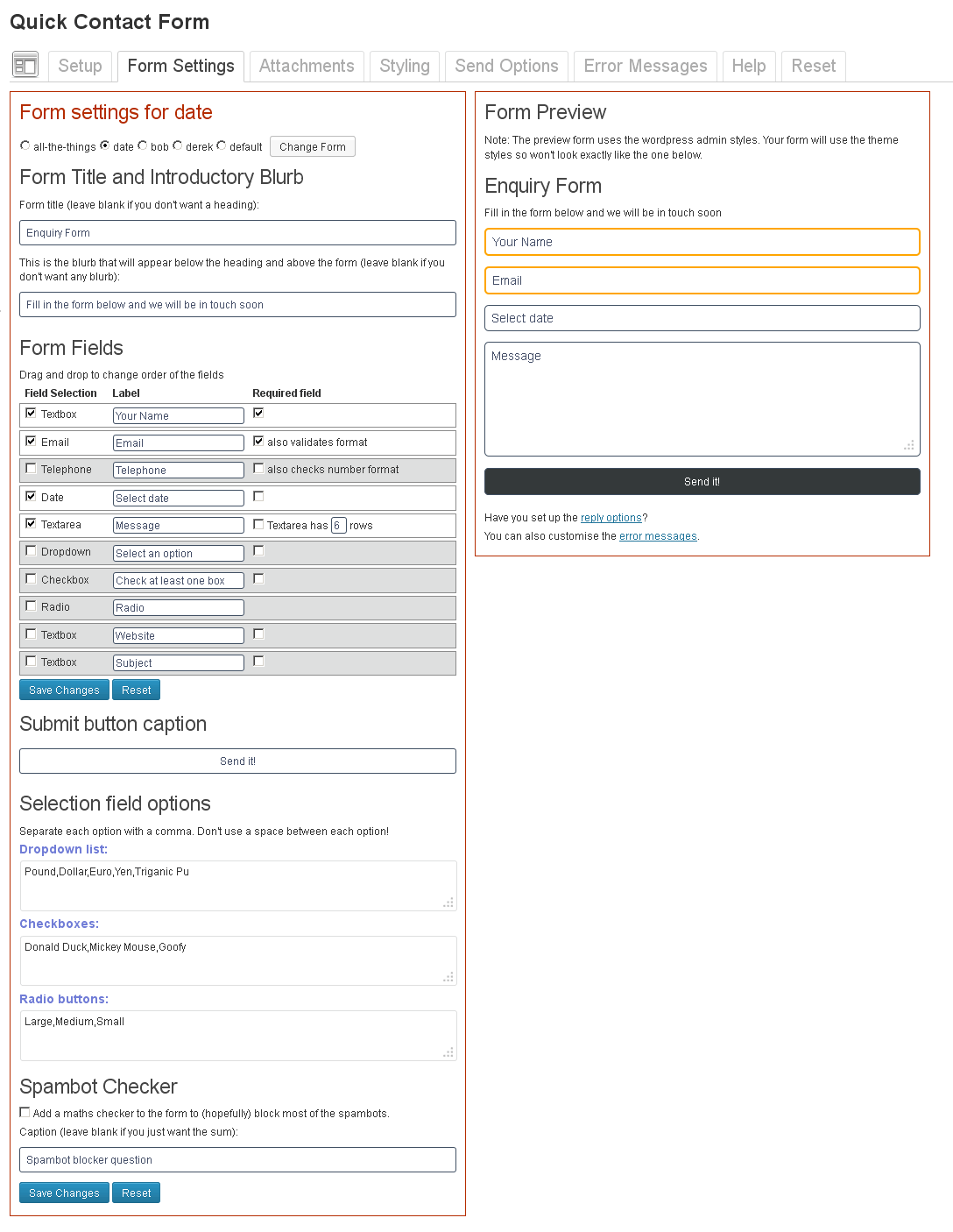 Go to your plugin list and scroll down until you see ‘Quick Contact Form’ and click on ‘Settings’. Select the ‘Form Settings’, ‘Error Messages’ or ‘Reply options’ tabs. Change the settings and Save (quite important this last bit).