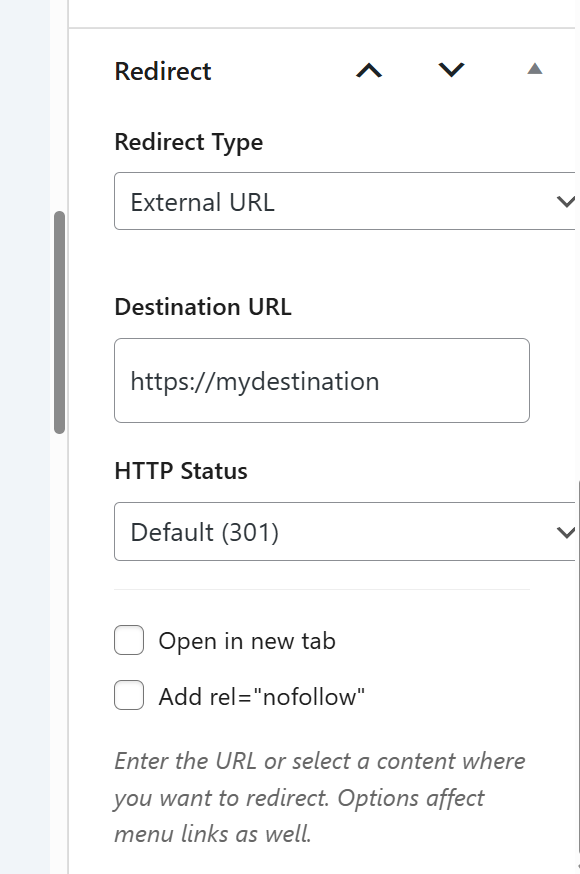rel="nofollow". - [New] Support for selectable HTTP Status Codes (301, 307, 308).