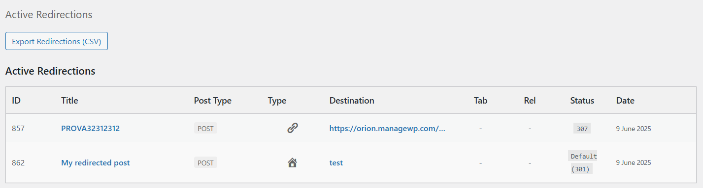 - Added Active Redirections” table and CSV export